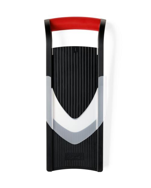 Triangle vegetable slicer with unique and patented parabolic blade. The special blade shape mimics the rocking movement and smooth cut of a chef’s knife and achieves an unrivalled cutting performance. With safety holder and two double-sided inserts for 1 mm, 3 mm and 5 mm slices and 4 mm julienne. The easily interchangeable inserts are safely stored inside the slicer. A solid blade protection ensures safe storage and long-lasting sharpness. Stainless steel blade.